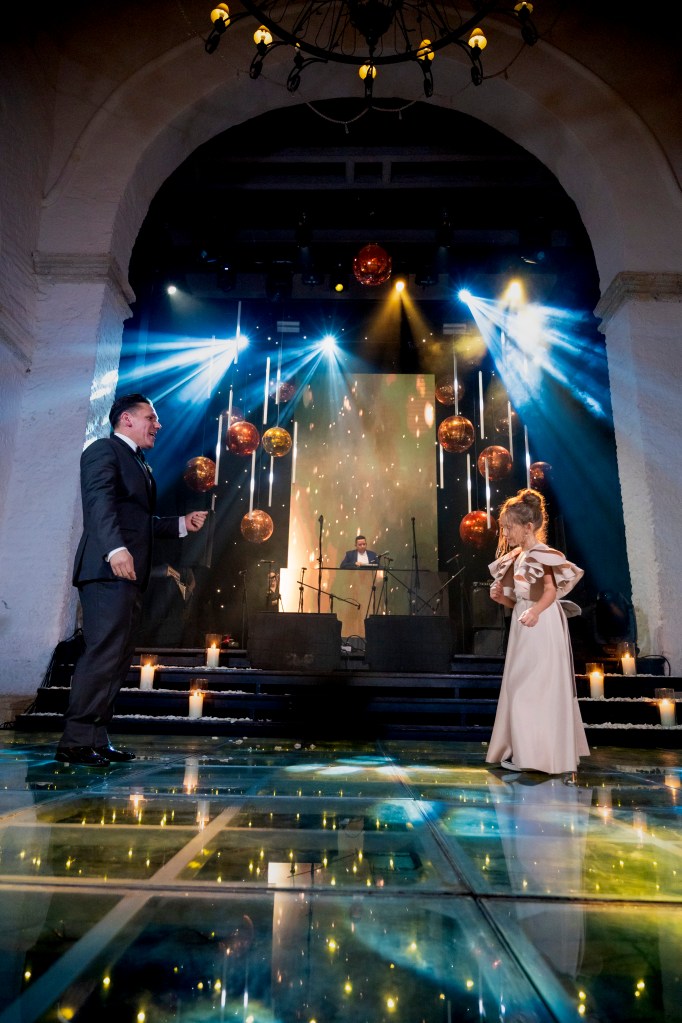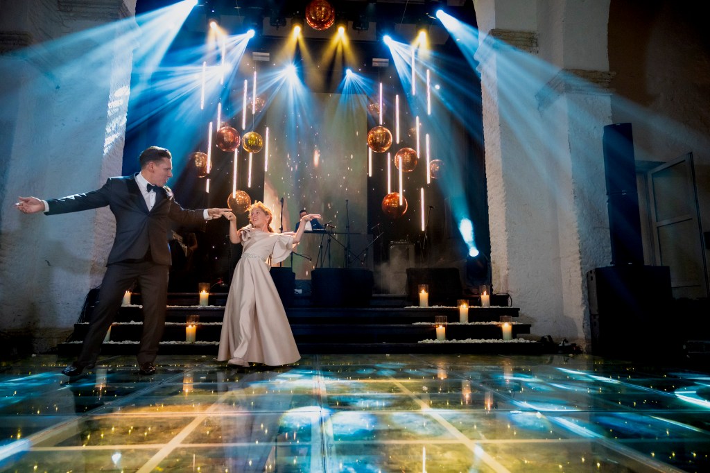 MODERN, FULL OF LIGHTS, COPPER DISCO BALLS WEDDING